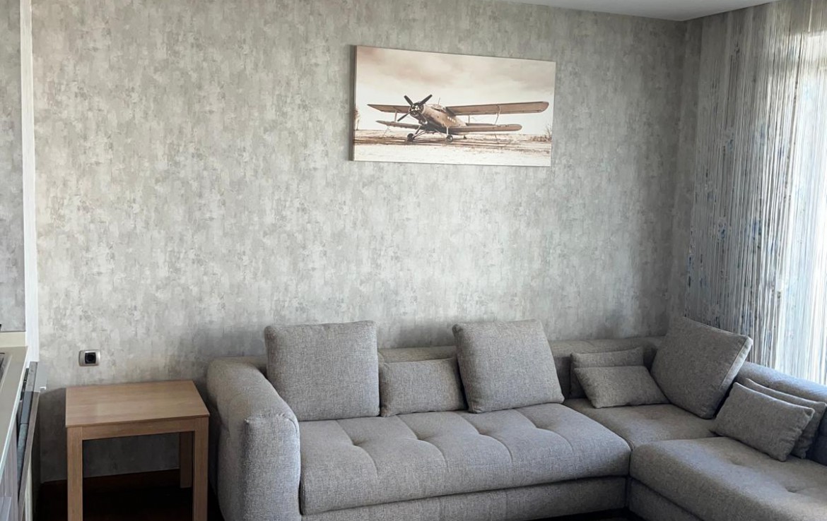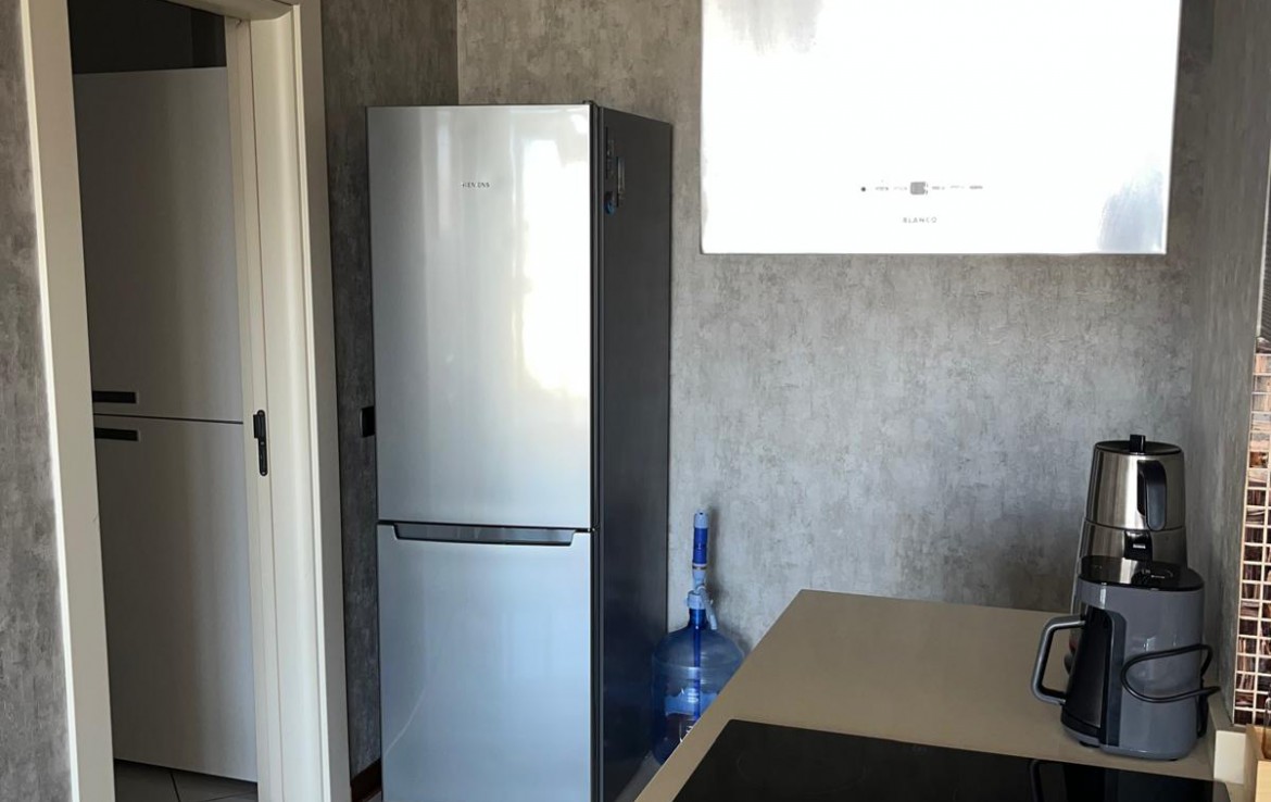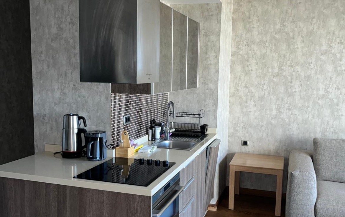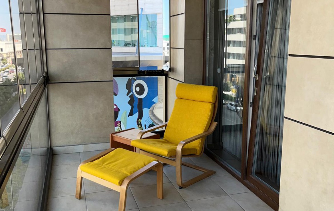 Eşyalı Kiralık Daire 1+1, brüt 90 m2, net 63 m2 alana sahiptir. 21 Katlı bloğun 3. katında yer almaktadır. Kuzey cepheli dairenin girişinde çelik kapı, görüntülü çok fonksiyonlu diafon ve portmanto bulunmaktadır. Klimalı salonun önünde yer alan geniş balkon katlanır cam ile kapatılmış olup yaz, kış kullanılmaktadır. Fonksiyonel mutfakta ankastre ürünler, 6 kişilik temel yemek malzemeleri bulunmaktadır. Koridordaki genel banyoda çamaşır makinesi bulunmaktadır. Oda da çift kişilik karyola, gardrop ve şifonyer yer almaktadır.